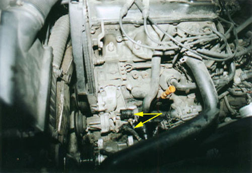 มองจากด้านหน้าเครื่องยนต์ เมื่อถอดเอาอัลเทอร์เนเตอร์ ( ไดชาร์ท ) พร้อมขายึดและสายพานออกไปไว้นอกตัวรถแล้ว ด้านล่างของภาพจะเห็นคอมเพรสเซอร์แอร์ ซึ่งถอดออกจากขายึดแล้ววางเอาไว้เฉยๆ โดยที่ไม่ต้องปลดท่อน้ำยาแอร์ สังเกตุตำแหน่งปลายท่อน้ำซึ่งถูกถอดออกจากชิ้นส่วนด้านหลังของปั๊มน้ำ ที่ตำแหน่งนี้จะมี 2 ท่อ และด้านล่างเป็นข้องอพลาสติก 1 ท่อ |