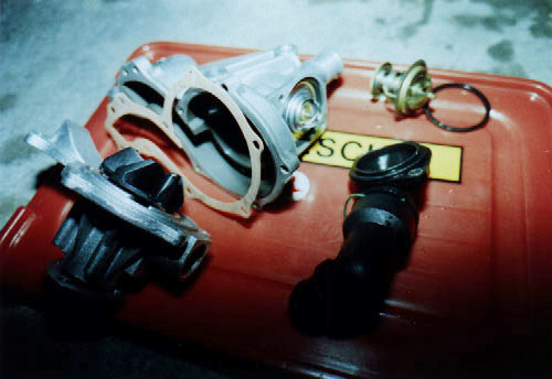 ปั๊มน้ำประกอบด้วย 2 ชิ้นส่วนใหญ่ คือด้านหน้าและด้านหลัง นำมาประกบกันโดยมีปะเก็นกั้นกลาง แล้วยึดด้วยสกรูว์เบอร์ 10 จำนวน 9 ตัว ชิ้นส่วนด้านหลัง จะเป็นโครงสร้างหลักที่ยึดติดกับตัวเครื่องยนต์ มีลักษณะเหมือนกระปุกน้ำ ด้านข้างเป็นปลายท่อโลหะให้น้ำยาไหลเข้าตรง ๆ 2 ท่อ สวมกับท่อยางซึ่งต่อมาจาก Heater และหม้อพัก ด้านล่างเป็นท่อน้ำยาไหลเข้า 1 ท่อ ซึ่งเป็นข้องอพลาสติค ภายในข้องอจะมี เทอร์โมสตัท ( วาล์วน้ำ ) ก่อนสวมกับท่อยางที่ต่อมาจากหม้อน้ำด้านหน้ารถ ตำแหน่งที่สวมท่อยางทั้ง 3 จุด จะรัดเอาไว้ด้วยแหวนรัดสปริง ชิ้นส่วนด้านหน้าคืออะไหล่ปั๊มน้ำที่ต้องเปลี่ยน มีลักษณะเป็นฝาปิดและมีชุดใบพัดพร้อมลูกปืน ซีลแกนใบพัด และแป้นยึดจานหมุนด้านนอก อะไหล่ชุดนี้จะมาพร้อมปะเก็น ราคาทั้งชุด 1,200 บาท