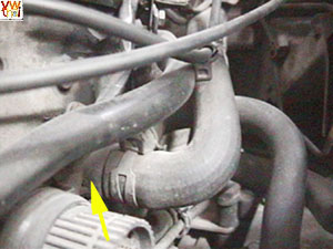 ตรงลูกศรสีเหลืองชี้ คือตาน้ำด้านข้างเครื่องยนต์ จะเห็นว่ามีท่อและสายคันเร่งเกะกะอยู่ด้านบน ซึ่งต้องขยับหลบให้ทางสะดวกก่อนลงมือนะครับ |