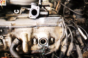 ภาพนี้ถอดตาน้ำออกมาวางบนฝาครอบวาล์ว แสดงให้เห็นหน้าสัมผัสของตาน้ำ กับปลายท่อระบายน้ำของเครื่องยนต์ว่ามันประกบกันอยู่อย่างไร และแหวนยางโอริงทำหน้าที่กันรั่วได้อย่างไร ที่เห็นหัวเทียนโด่อยู่อย่างนั้น เพราะได้ถอดสายออกไปชั่วคราวนะครับ |